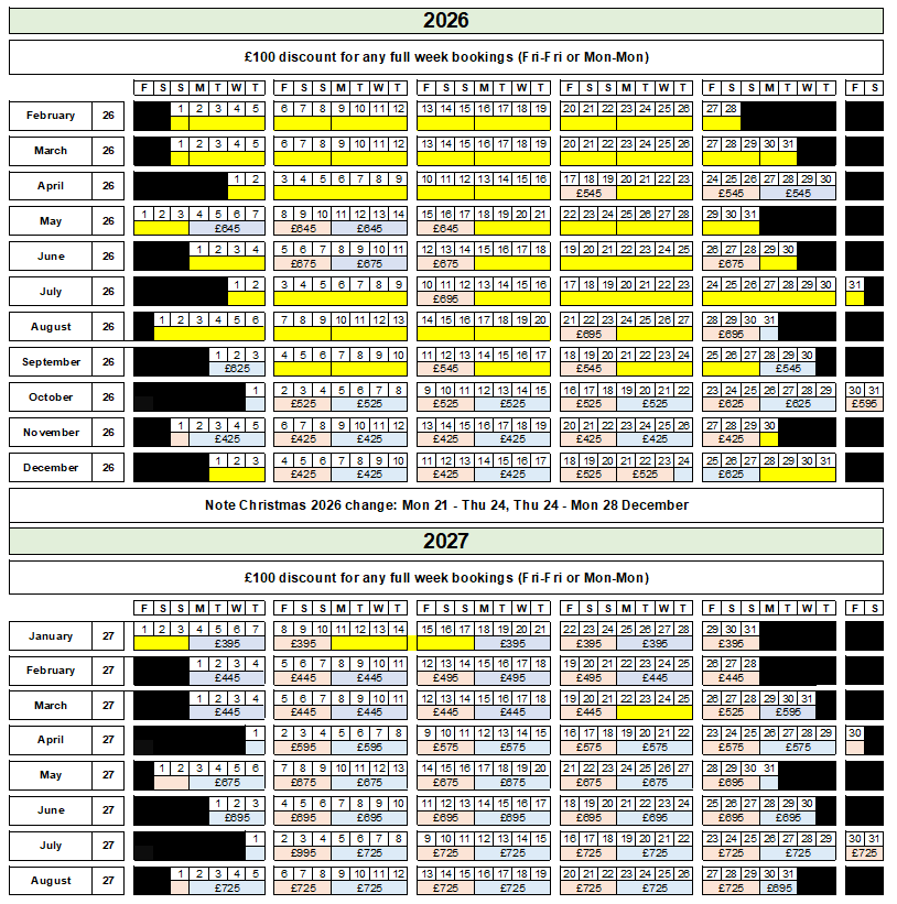 Bookings are usually Friday to Friday or Monday to Monday full weeks but we also accept Friday to Monday (3 nights) and Monday to Friday (4 nights) bookings. A discount of £100 can be applied to full week bookings (Fri-Fri or Mon-Mon).